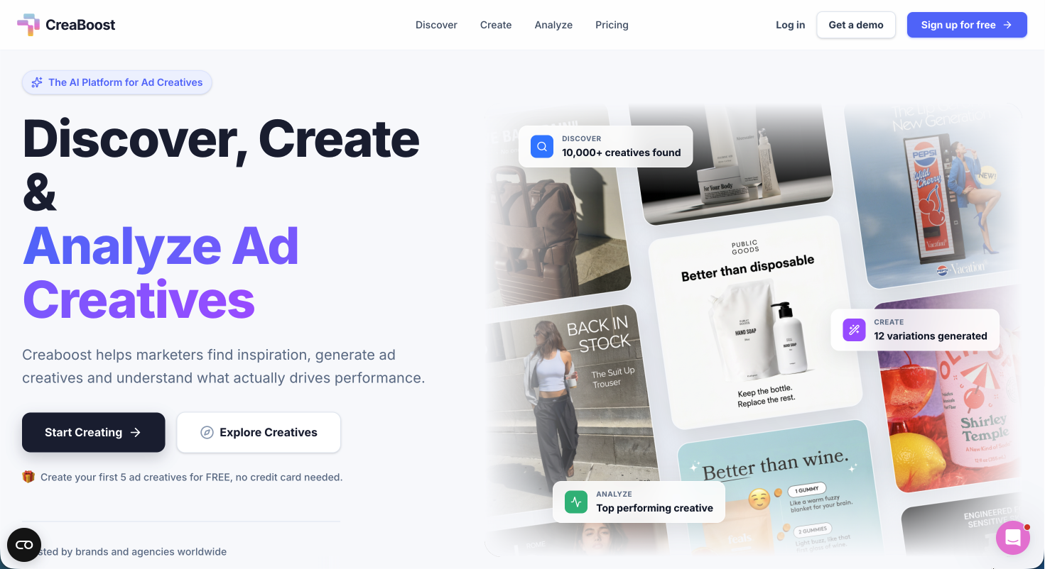CreaBoost brings discover ad creative solutions, production, and measurement into a single platform built for teams that need to move fast. The Discover module pulls every ad running across Meta, TikTok, Google, LinkedIn, and more into shareable inspiration boards. The Create module turns a product URL into platform-ready concepts with batch resizing locked to your brand identity. And performance analytics surfaces fatigue signals, tags your visuals automatically, and shows you exactly which assets to scale and which to retire. If you're ready to stop reacting and start building a real creative engine, explore AI ad creative tools that make it possible.